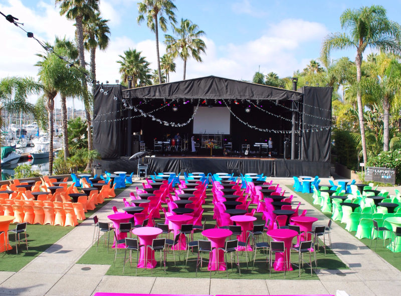 Social events should seat couples or families individually at 36" or 48" round cocktail tables, per household, consistent with state guidelines.